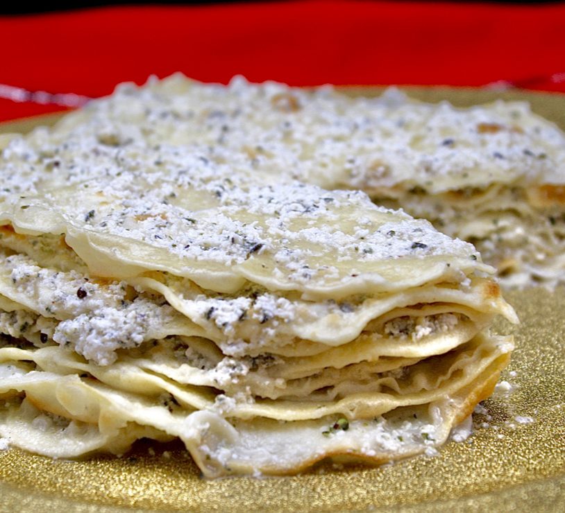 5. Se pune o foaie uscată de blat pe un platou, se insiropează cu grijă cu sirop și se unge cu julfa amestecată în prealabil cu zahăr, se adaugă următoarea foaie peste prima și tot asa unele peste altele ca un tort. Acum mai nou, se aromează umplutura cu vanilie, coajă de lămâie sau rom, însă gustul original este cel fără arome, un neegalat gust de cânepă.